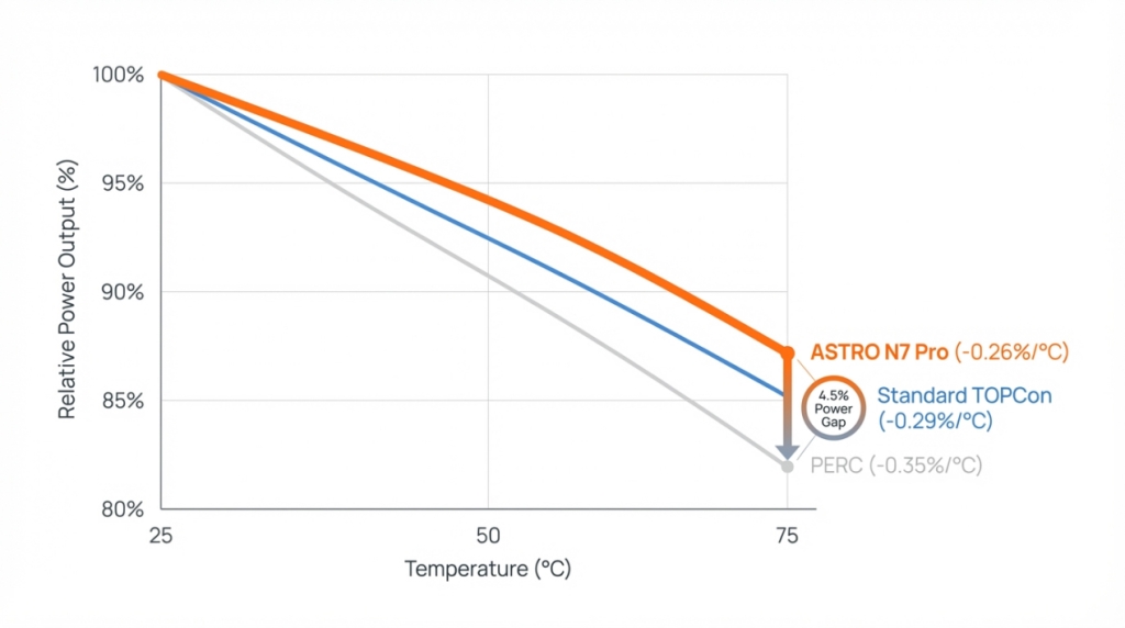 Assuming a module operating temperature of around 75°C (50°C above STC), a standard n-type module (-0.29 %/°C) would lose about 14.5% of its rated power, while a flagship ASTRO N7 Pro (-0.26 %/°C) would lose roughly 13%. While a 1.5% difference may sound small, in an industry fighting for every fraction of a cent in LCOE, it can translate into a meaningful operational advantage over the course of a full year of operation.
