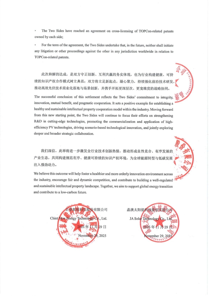 Building on mutual agreement, on November 29, 2025, Astronergy and JA Solar jointly announced that the two companies and their affiliates (hereinafter referred to as “Two Sides”) have reached a settlement regarding the patent disputes currently ongoing worldwide.