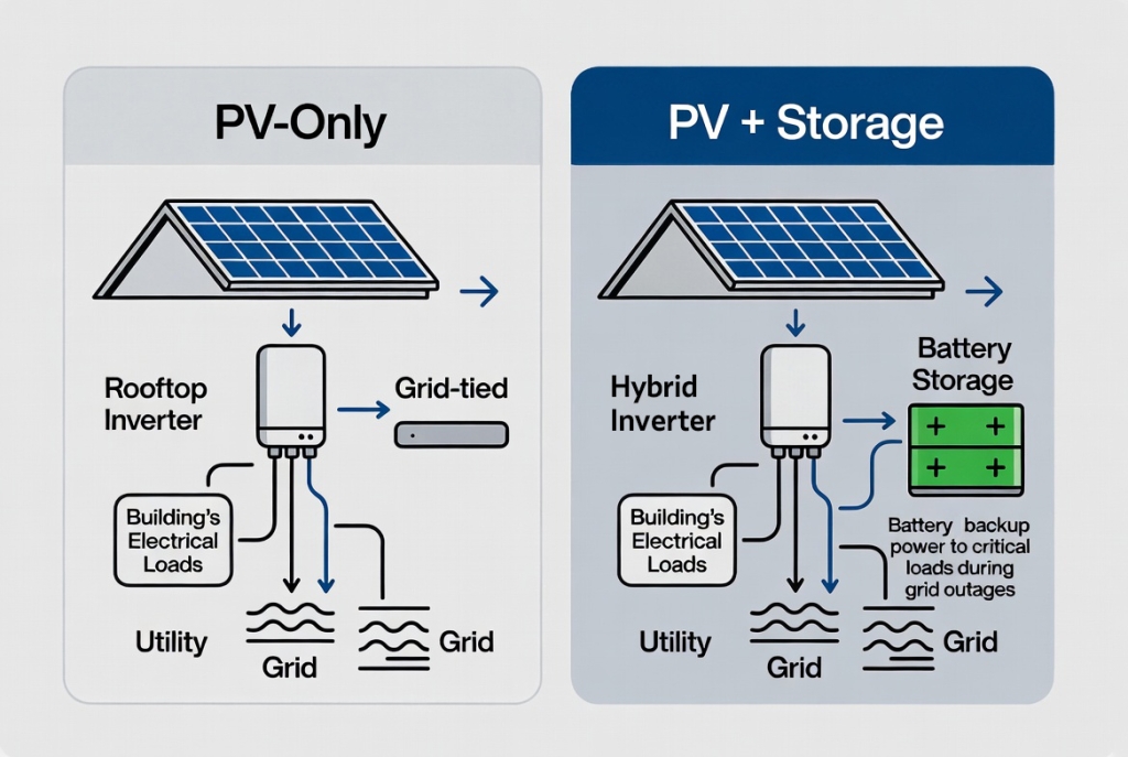 The biggest difference between PV-only and PV + storage is not simply the addition of a battery. It is the change in how solar electricity can be used.